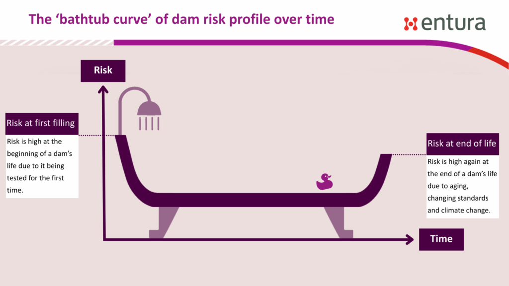 The obvious answer is that both hold water, but there’s something more, which keynote speaker Andrew Watson of BC Hydro referred to at the recent NZSOLD/ANCOLD conference. He described the risk profile of a dam over time as ‘the bathtub curve’.